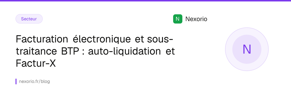 La facturation électronique en sous-traitance BTP cumule deux complexités : la réforme 2026 et les règles spécifiques de TVA du bâtiment. Auto-liquidation, mentions obligatoires, retenue de garantie — voici comment gérer tous ces cas dans vos factures Factur-X avec Nexorio.